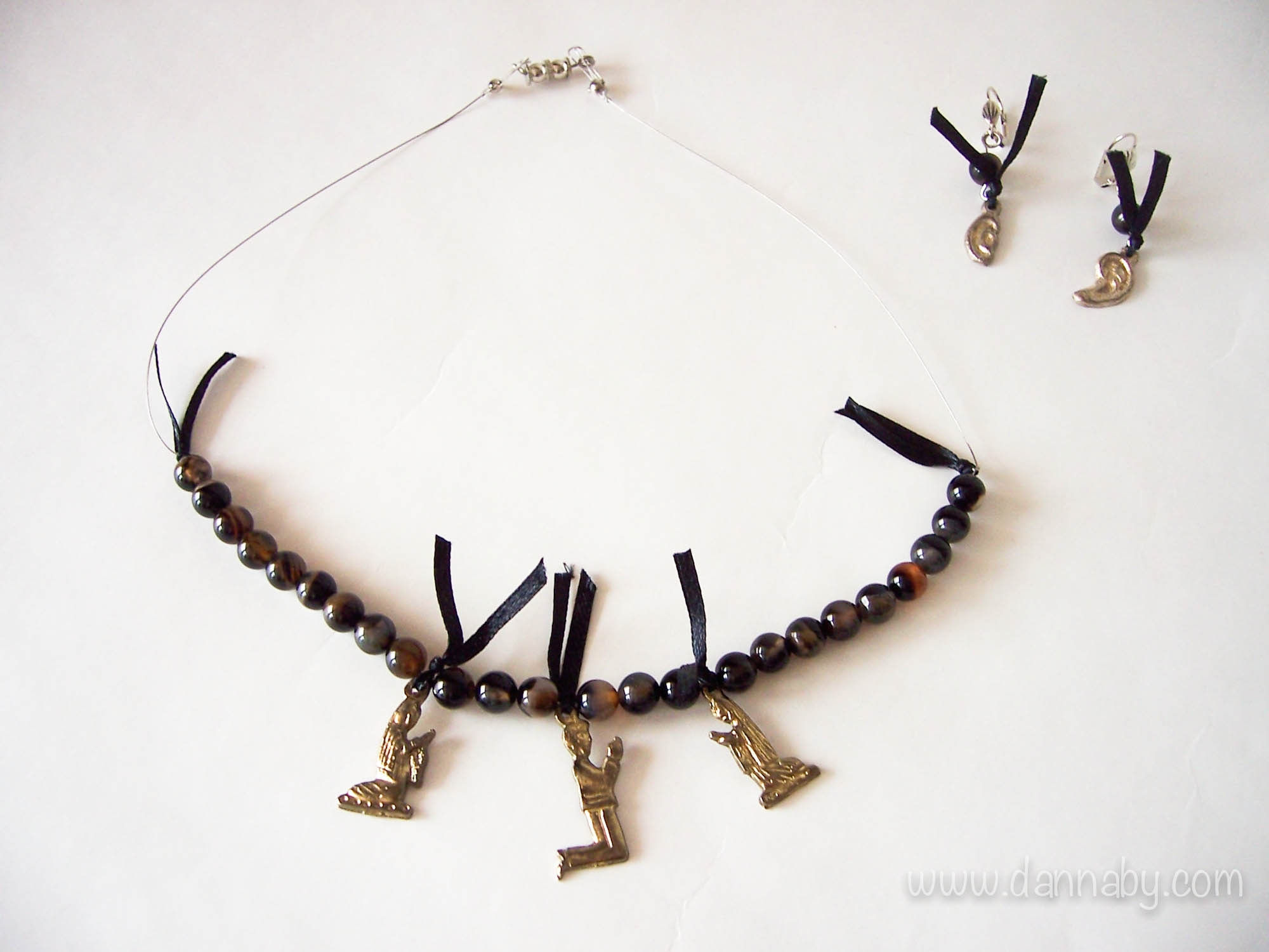BlackPrayers collar is composed of black cat´s-eye gemstones and silvery metall alloy female and male praying figures tied on with black ribbons. It is in a set with earrings with the same metall ears hanging on. So prayers are listened.