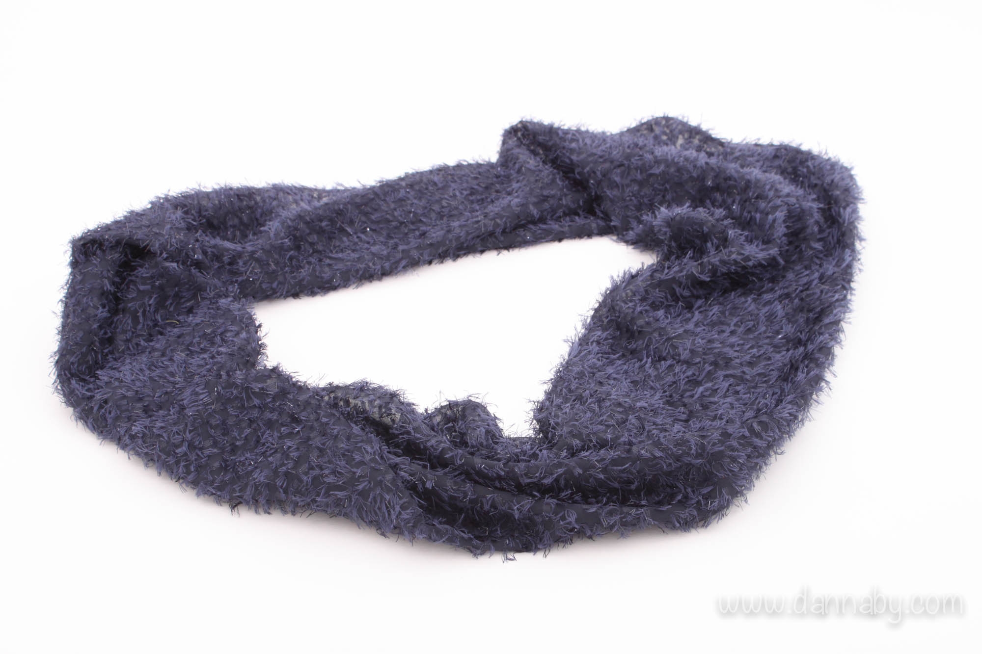 You see a dark-blue, light, fluffy ring-scarf frizzing around your neck for great sensation and beauty.