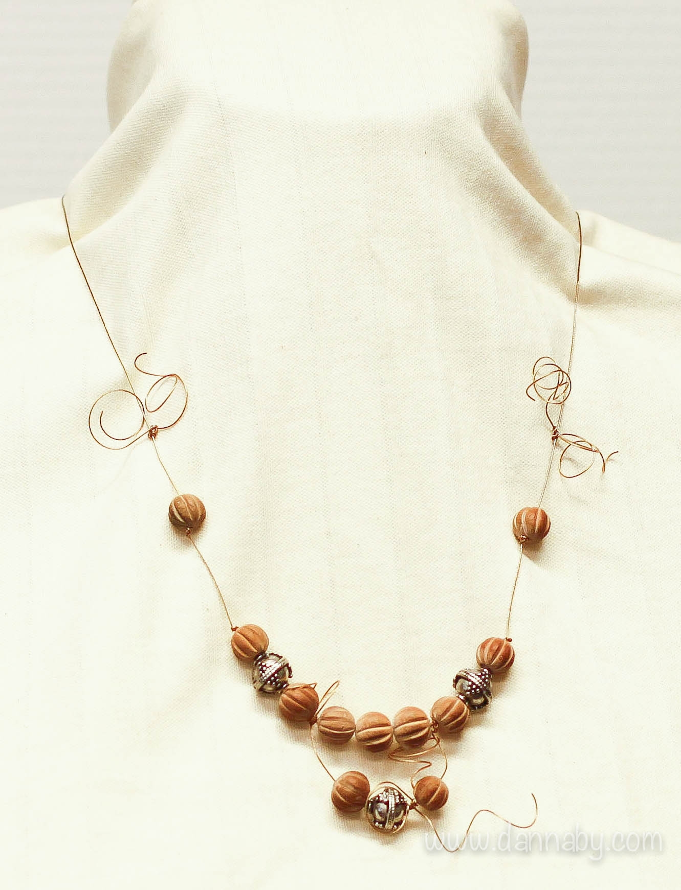 A nice short to medium necklace made of pewter and baked clay, on colored nylon coated stainless steel thread. A wild combination!