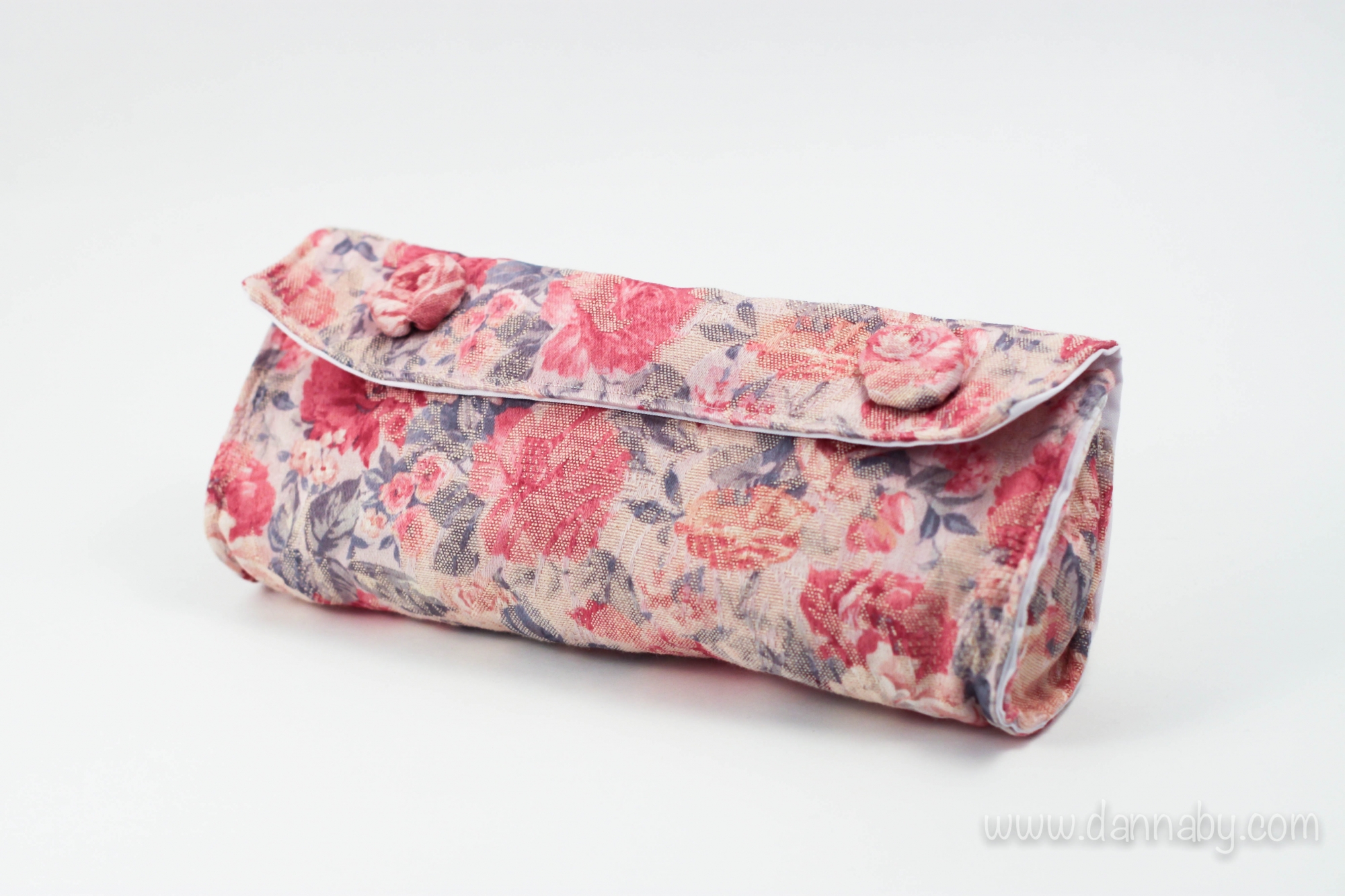 Small, soft upholstery fabric beauty-case. It is zippered and clip-closing. Its water-resistant lining will save your belongings. It has one big pocket inside. Clips are hidden by floral decoration.