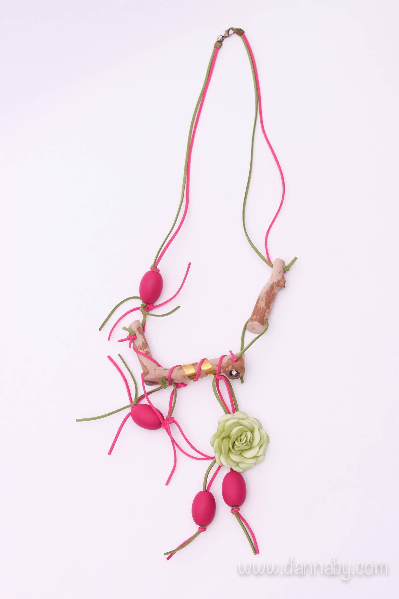 A necklace made of drift wood with Swarovski crystal elements inlaid; leather, wooden beads, copper stripe, satin flower were used to combine it.
