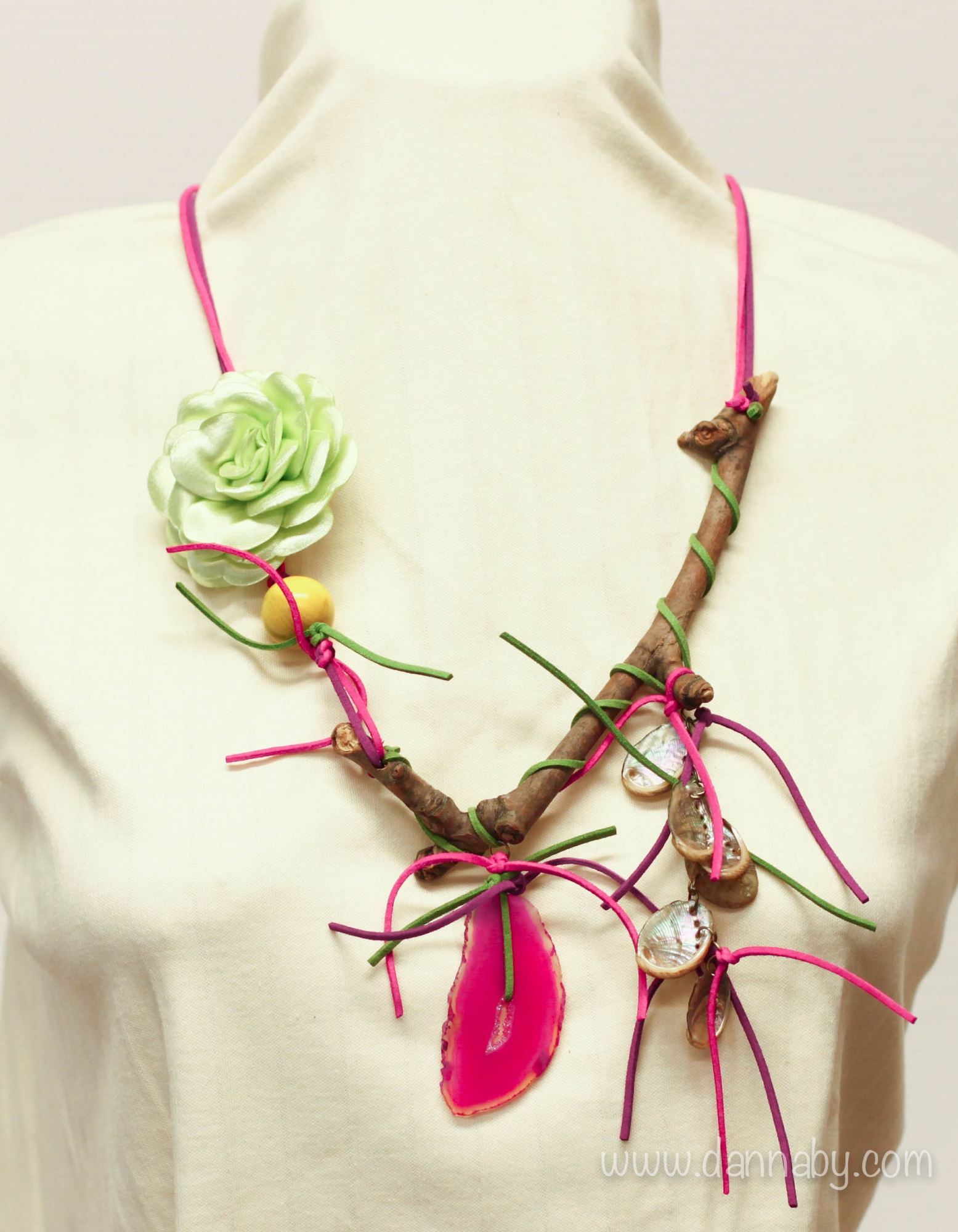 An absolutely gorgeous necklace made of drift wood, leather, wooden bead, fuchsia colored agate, nacre sea shells (Haliotidae), and satin flower.