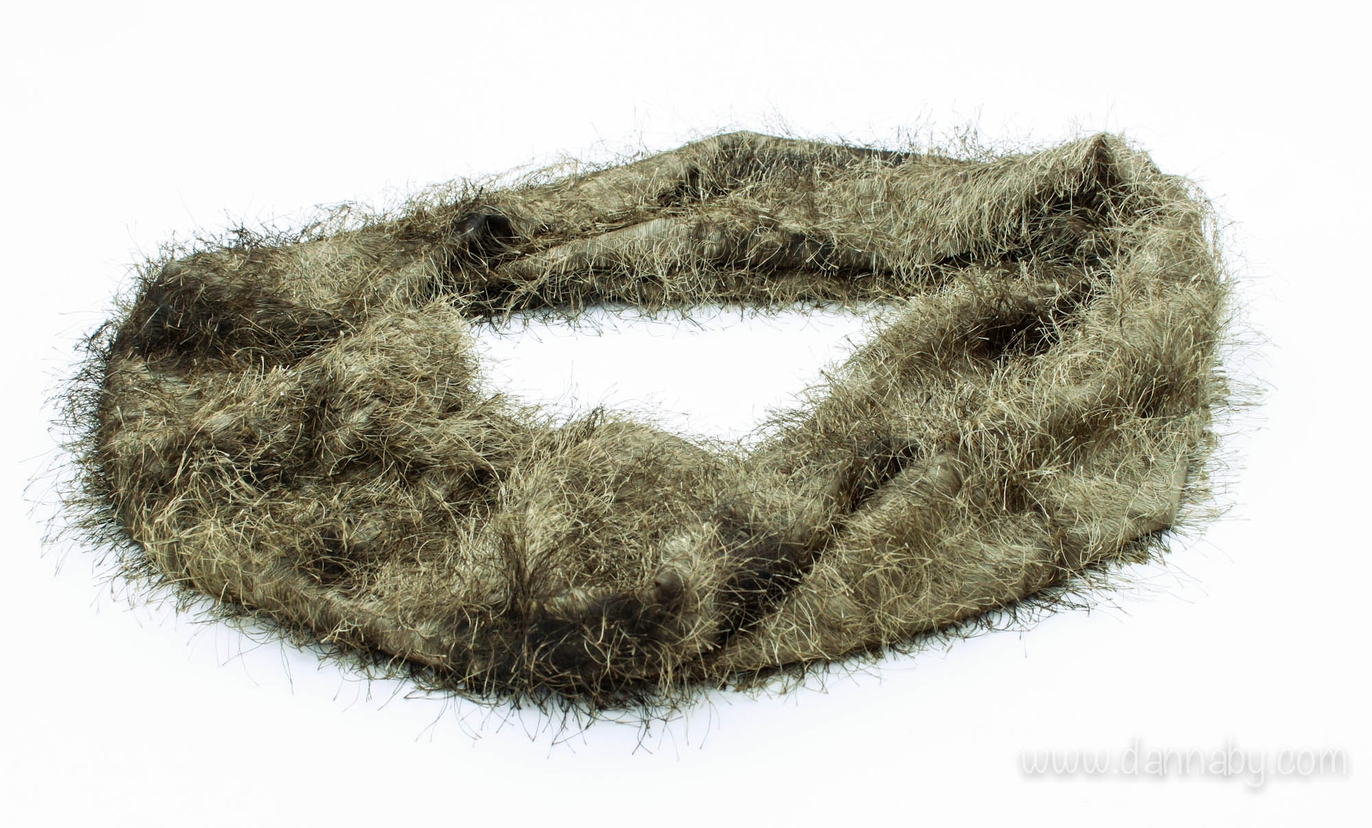 There are just clearer and darker blots on light olive-green background on this ring-scarf. Some fuzz is in addition for your comfortable sensation.