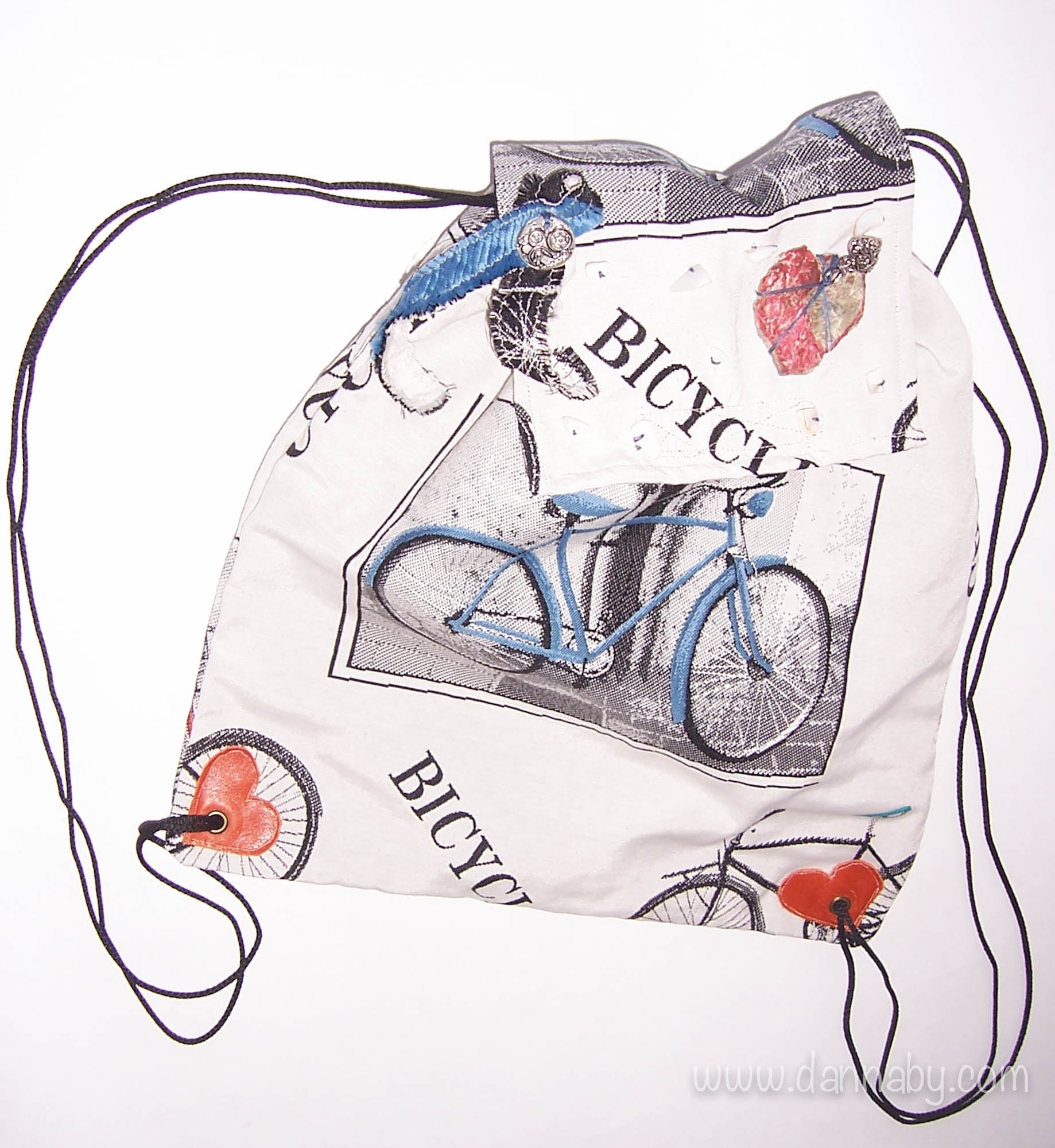 A stone-heart is beating for love. The backpack has more other decorative appliqués. You can close it with velcro.