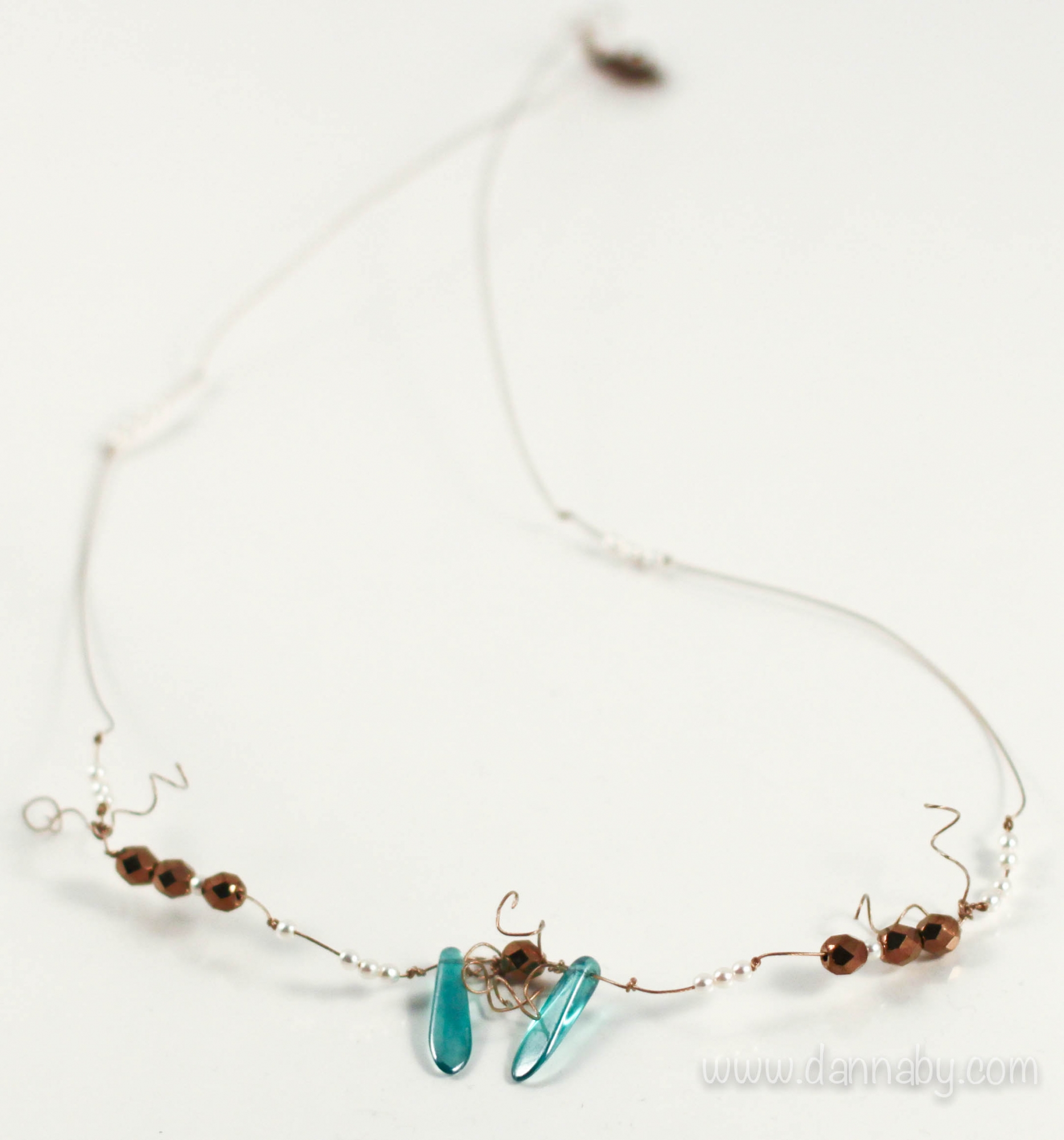 A nice short to medium necklace made of Czech crystal beads, bronze beads and synthetic tiny pearls, on colored nylon coated stainless steel thread. A cold combination!