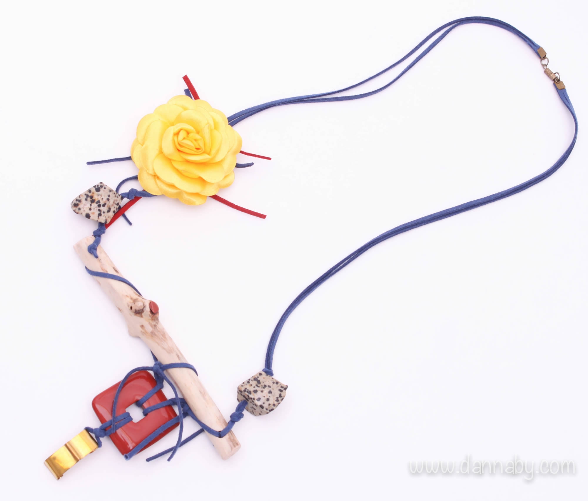 A calmed-down necklace made of drift wood with a tiny red jasper stone inlaid and using leather, satin flower, two pieces of dalmatian jasper, a copper stripe on a big red jasper stone. Seriously clean lines.