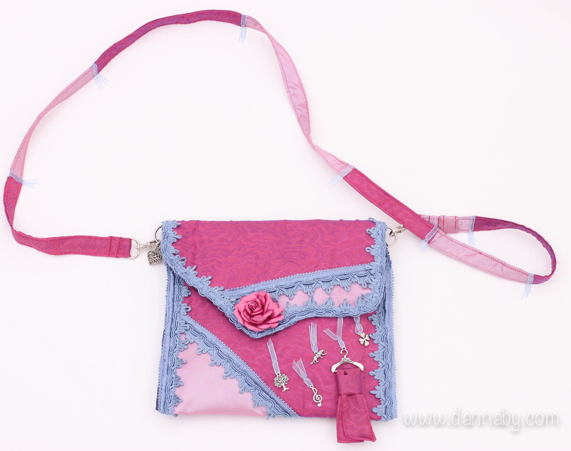 It is made of special synthetic fabric and color-changing shantung-like satin in combination of silk linings and a satin rose on a magnetic clasp. It is decorated with rayon lace and metal pendants tied up with organza ribbons.