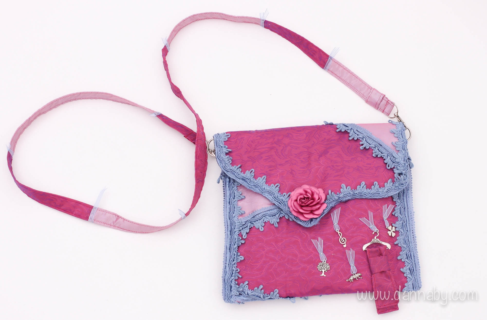 It is made of a special synthetic fabric and color-changing shantung-like satin in combination with silk linings and a satin rose on a magnetic clasp. It is decorated with rayon lace and metal pendants tied up with organza ribbons.