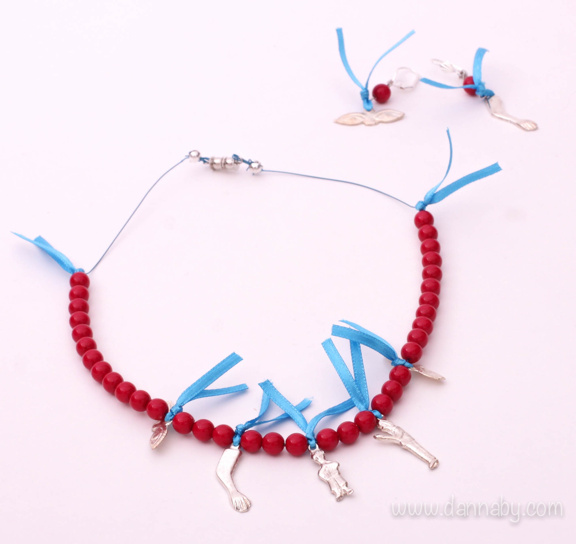 This is a nice, but onlooker set of red Czech crystal beads on a blue nylon coated stainless steel string, strong enough to suppoert them. White metal alloy magic figures are tied up with blue satin laces.