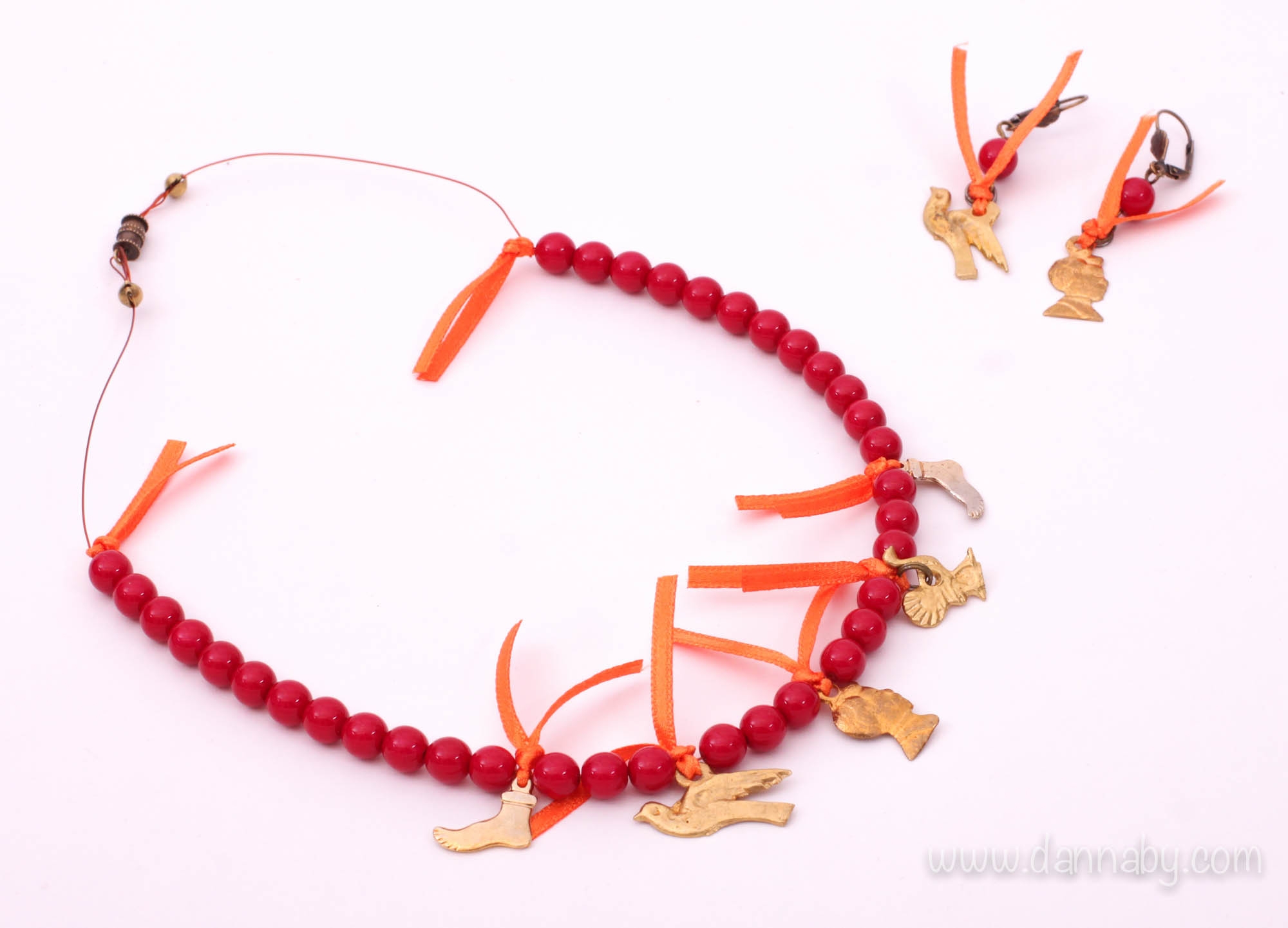 Colors mean a lot of things: your mood, your feelings toward the life. Colors can even change your humour and they can have fabulous power on the spectator. Here we are seeing a nice set of red Czech crystal beads on an orange nylon coated stainless steel string, strong enough to support them. Copper alloy magic figures are tied up with orange satin laces. The head is for the reason, the dove is for freedom, peace or love, feet mean travel or changes and the turkey is for being proud of what you are.