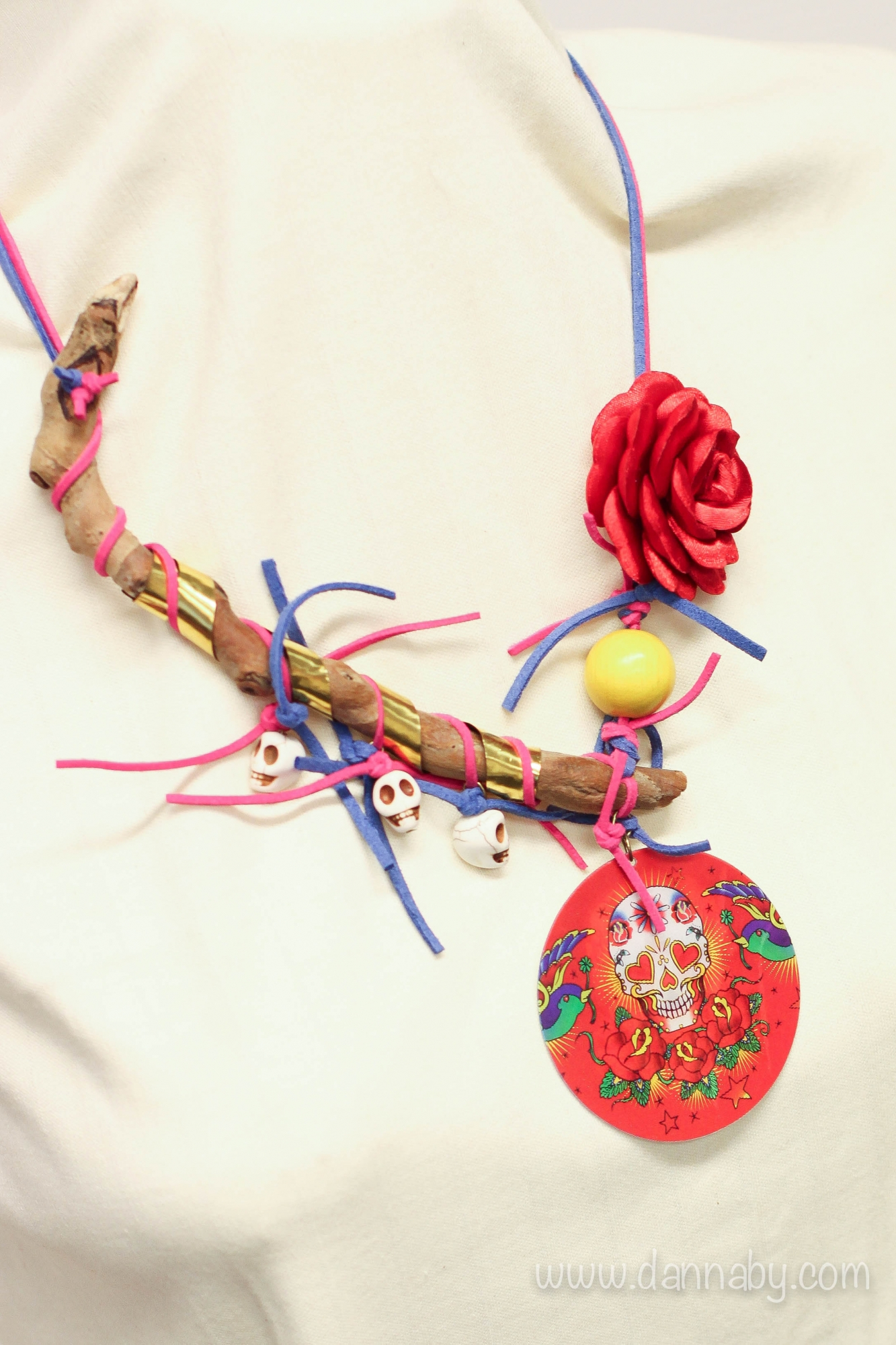 A gorgeous scary-wild necklace made of drift wood, leather, wooden beads, tiny synthetic skulls, a satin flower and a 3D-effect plastic disk with two different skull images: one on azure and one on red background.