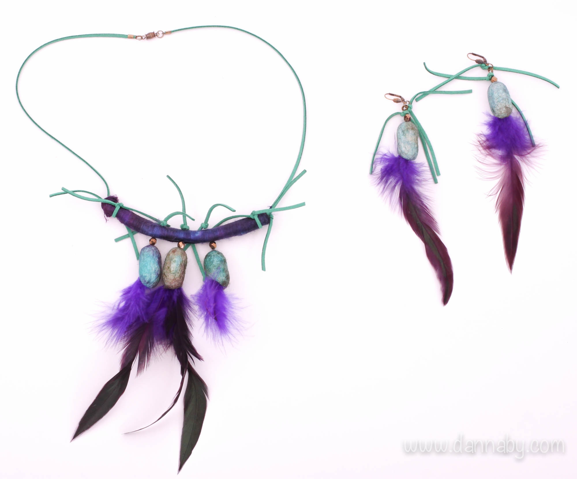 The short leather strap necklace is composed of a real silk carrier rod and cut silk cocoons, hand-dyed with natural colors. Some Czech crystal beads will give some light to the composition with extravagant fluttering cock's feathers.