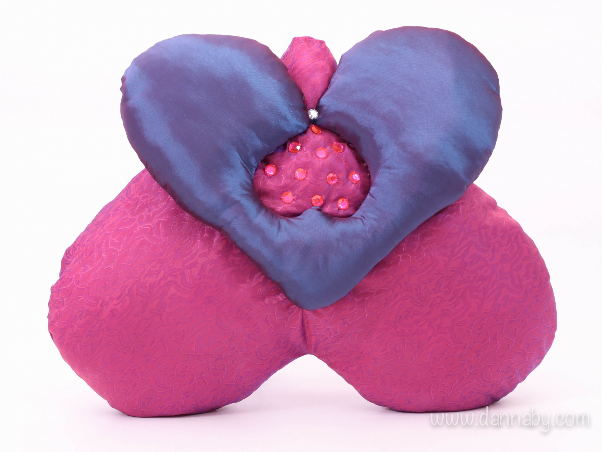 Three-in-one heart pillow is made of two kinds of resistant synthetic fabrics. It is decorated with synthetic gems. This pillow will lift your love-seat or bed or your bedroom. Enjoy it!