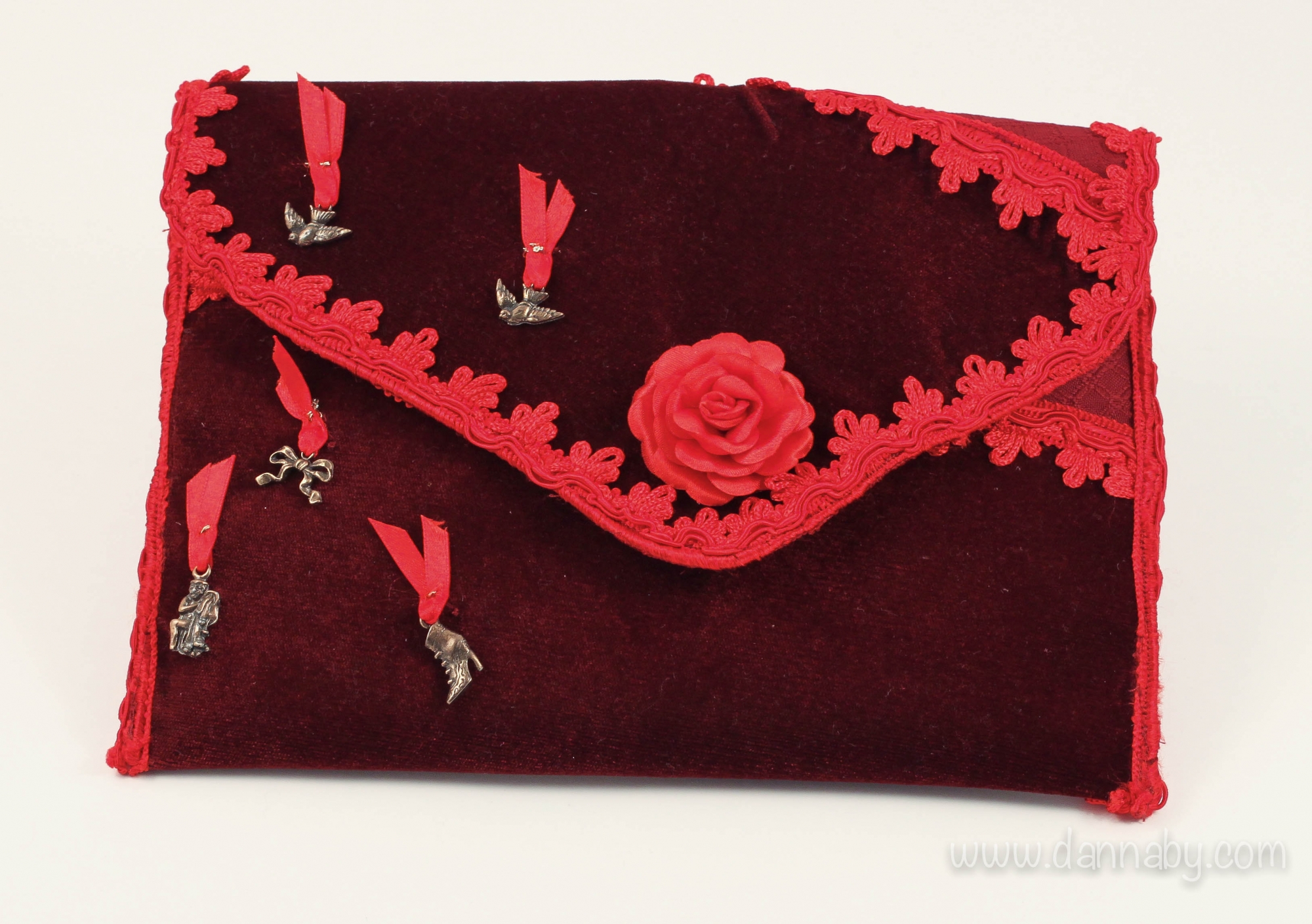 It is a gorgeous baroque envelop bag: a combination of claret velvet, soft upholstery fabric and bright red silky lace. It has metal decorations hanged on it with red ribbons, as if votive objects.
