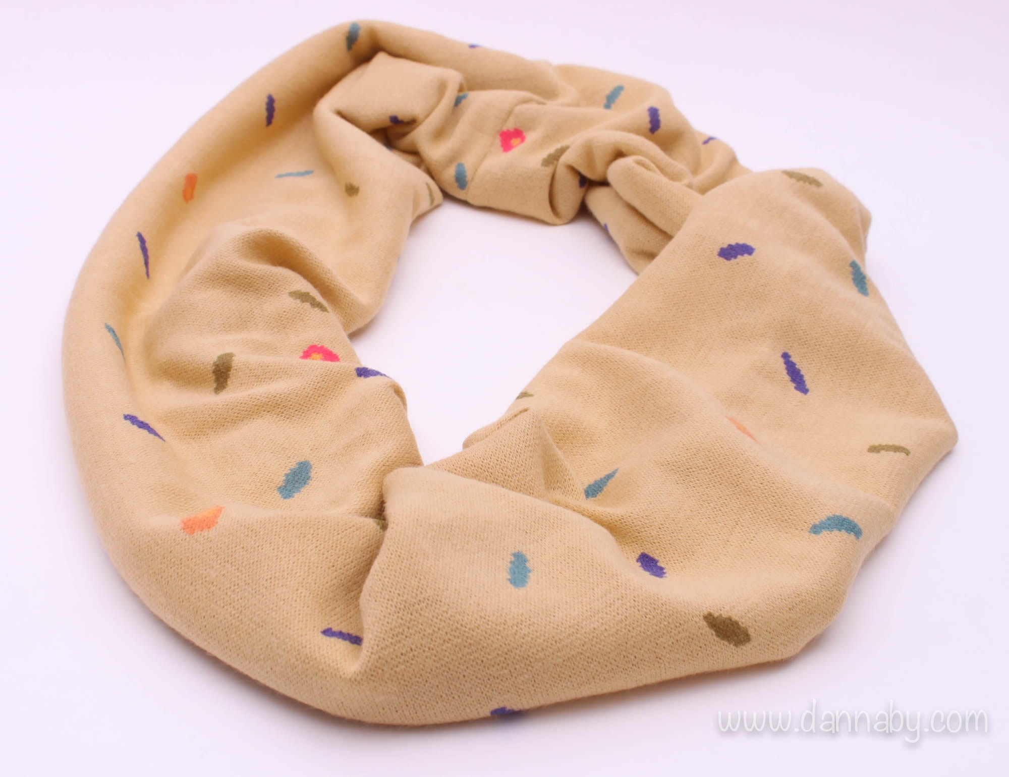 This light tricot ring-scarf can give you warm-feeling on chilly days. Colorful flower petals are dancing on it calling spring.